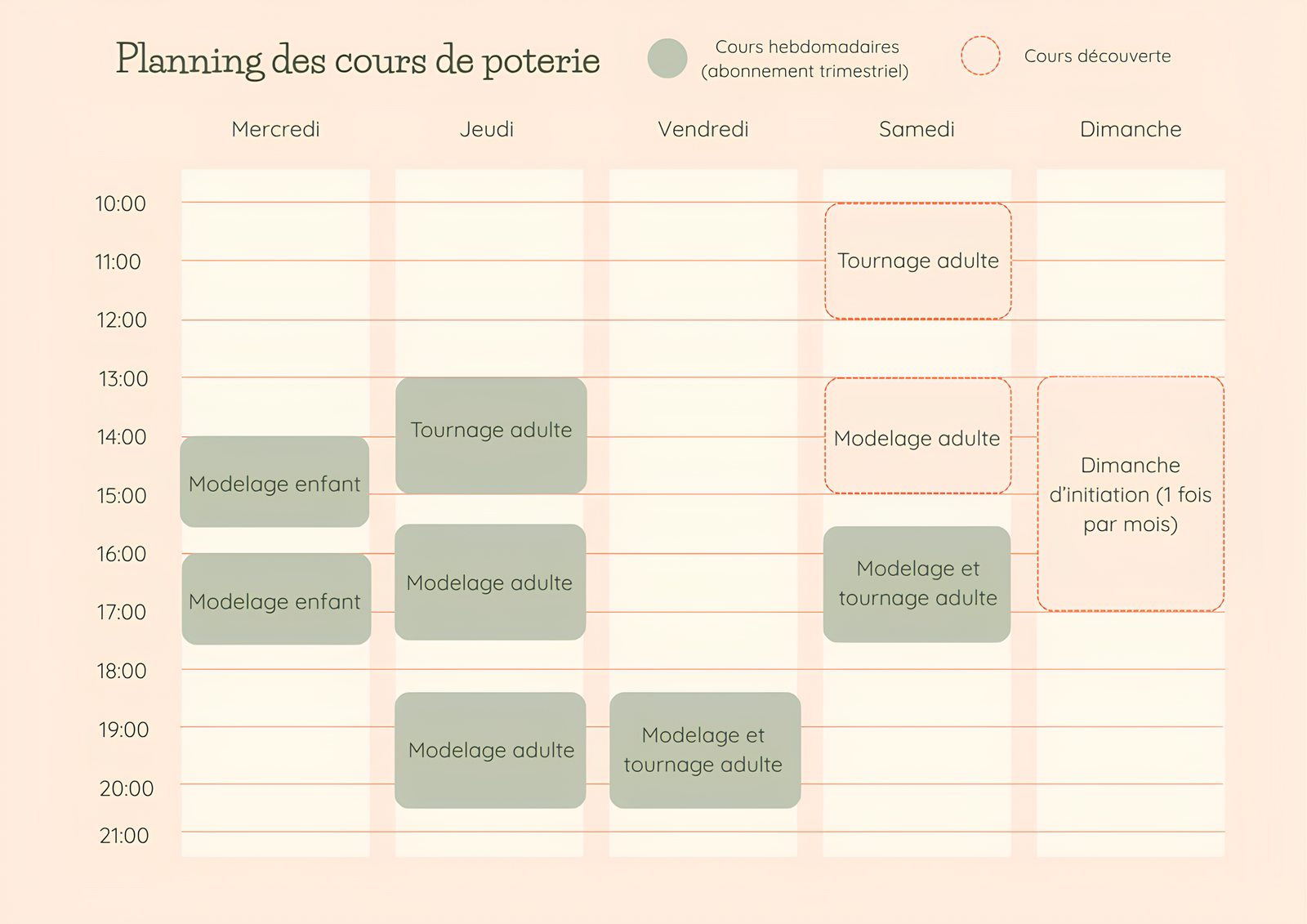 Installez dans votre emploi du temps une parenthèse de deux heures, chaque semaine, pour façonner, décorer et partager autour de la poterie. Ce rythme régulier vous permet d’installer une véritable pause créative, un moment doux et complice où l’on prend le temps de façonner la terre et de se retrouver autour du projet de chacun.