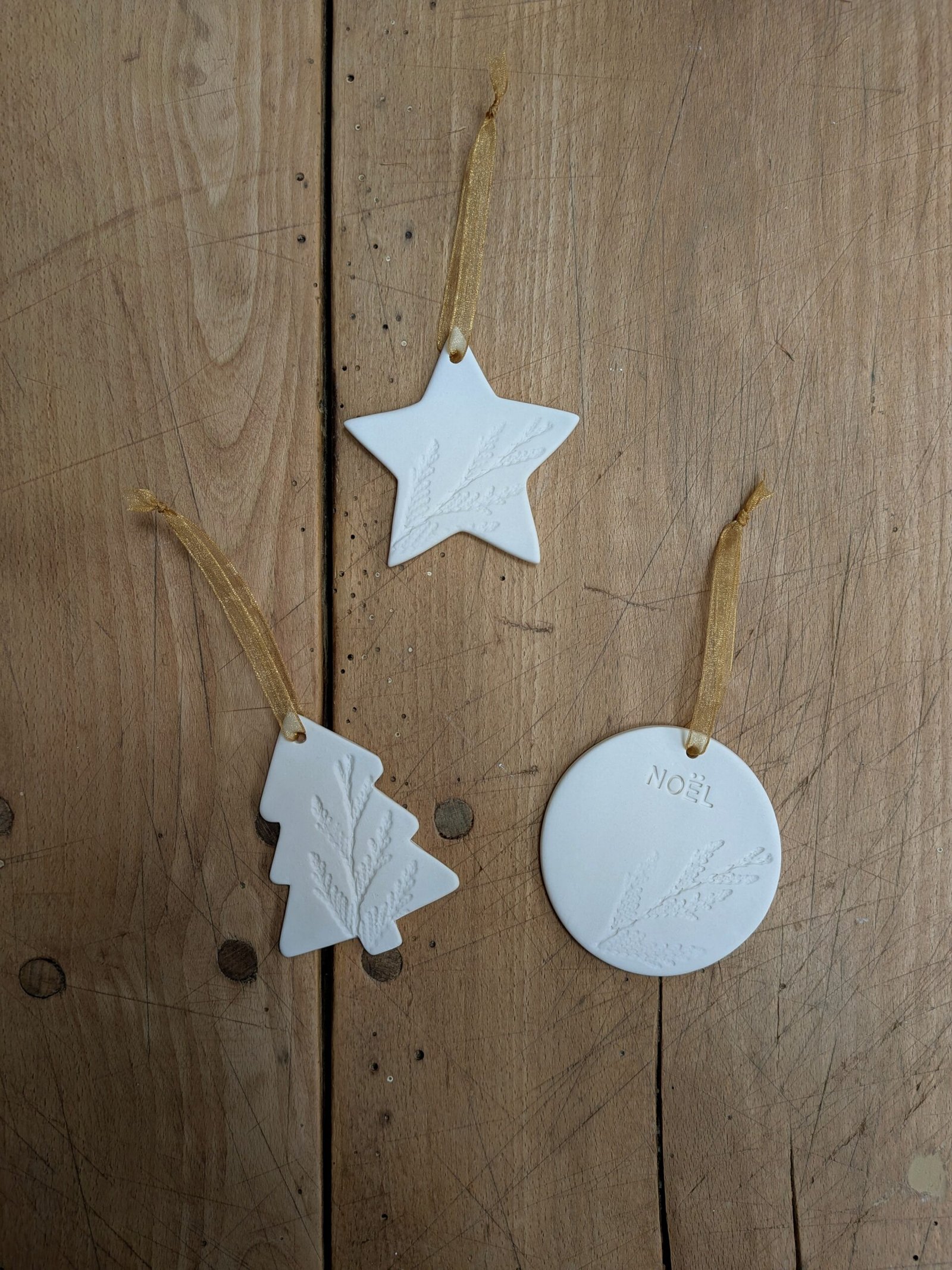 Les ornements de sapin sont réalisés en porcelaine mate, laissée non émaillée, pour révéler la douceur et la texture naturelle de la matière.
