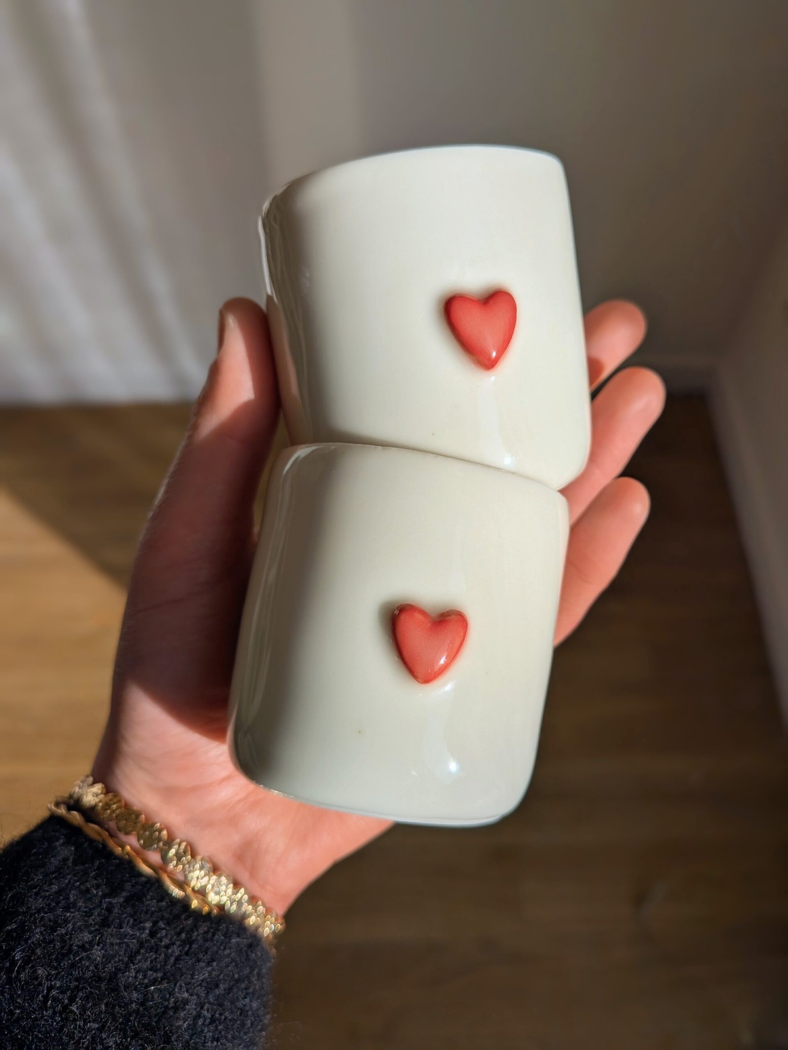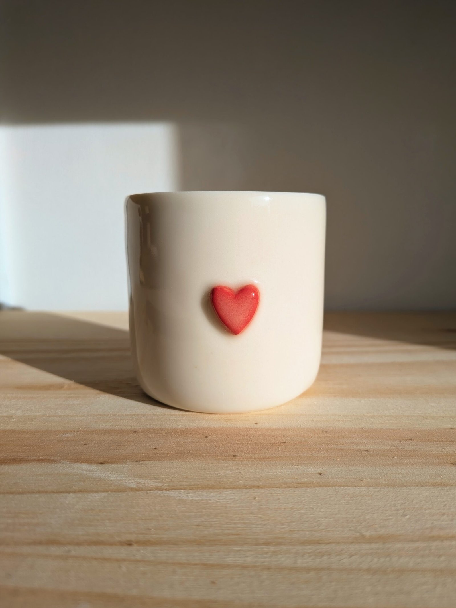 Entièrement émaillée, cette tasse offre une surface lisse et lumineuse. Elle est ornée d’un petit cœur en relief, peint à la main dans des nuances de rouge et de rose foncé. Lors de la cuisson, un léger effet laiteux se crée sur le cœur, apportant de la profondeur et de l’intérêt à ce décor volontairement simple. Chaque cœur révèle ainsi de subtiles variations, rendant chaque pièce singulière.