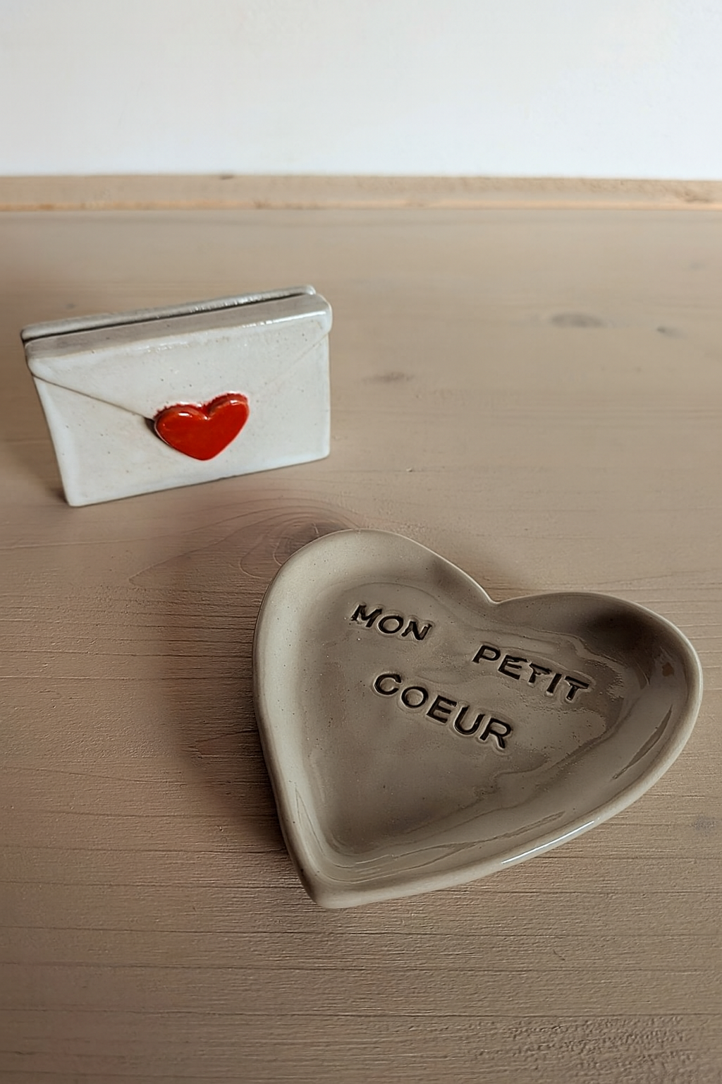 La coupelle en forme de cœur sera émaillée avec un émail transparent, laissant apparaître la couleur naturelle de la terre.